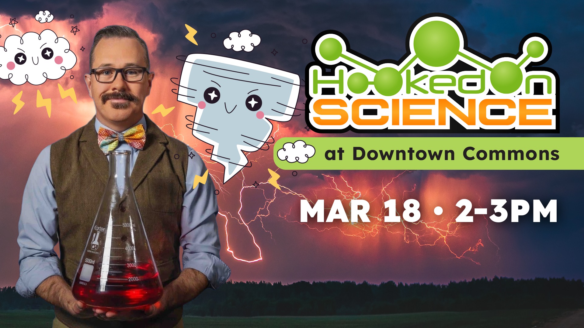 Come to the Downtown Commons to watch Hooked on Science. This fun educational program is hosted by Mr. Science, who has also appeared on NBC’s Today Show, Sherri, Fox & Friends, RFD-TV, and Weather Nation.