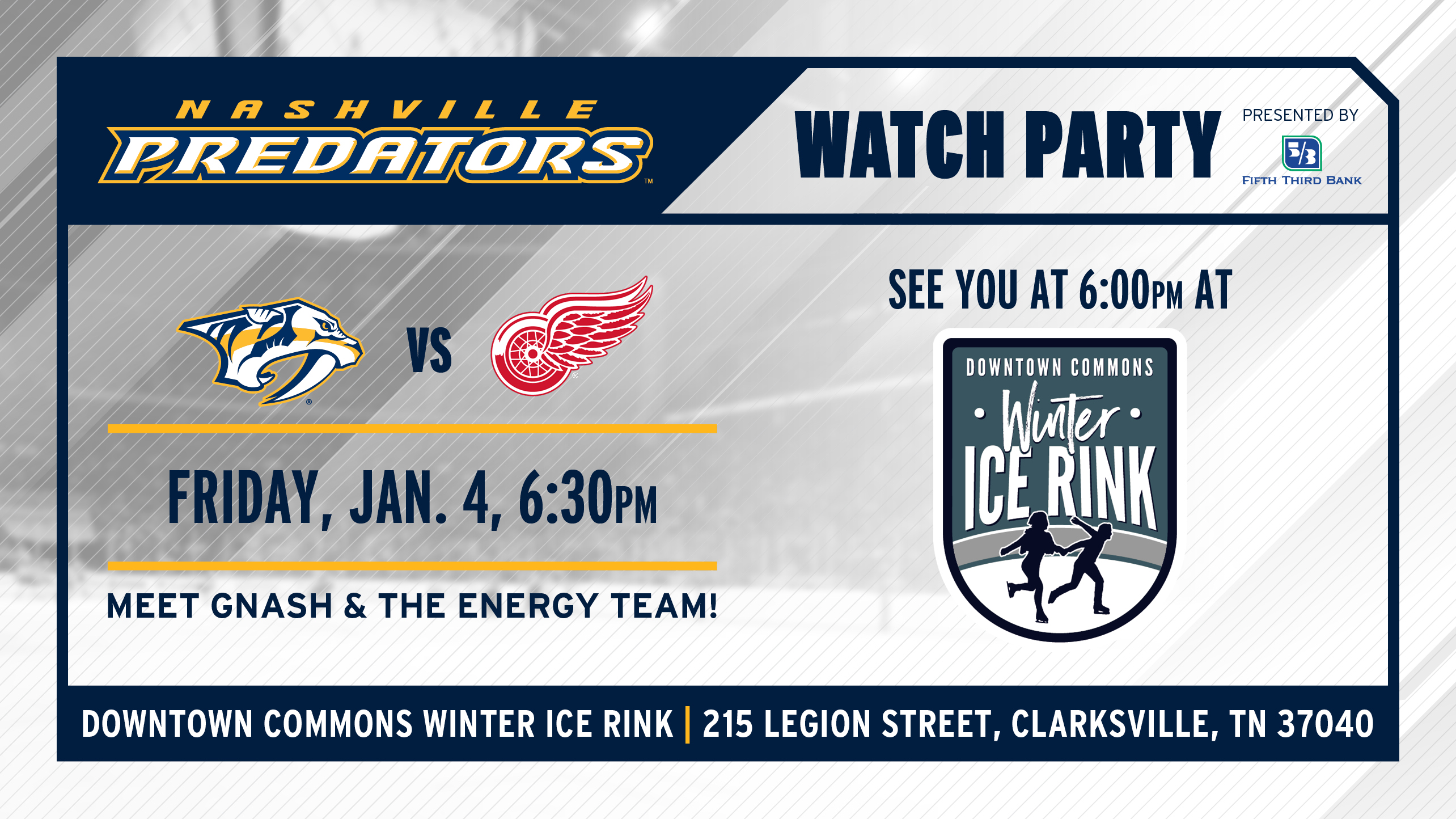 Downtown Commons 215 Legion Street, Clarksville, TN, United StatesJoin us at Downtown Commons as the Nashville Predators take on the Detroit Red Wings. Game begins at 6:30 PM. GNASH and the Energy Team...Read More »